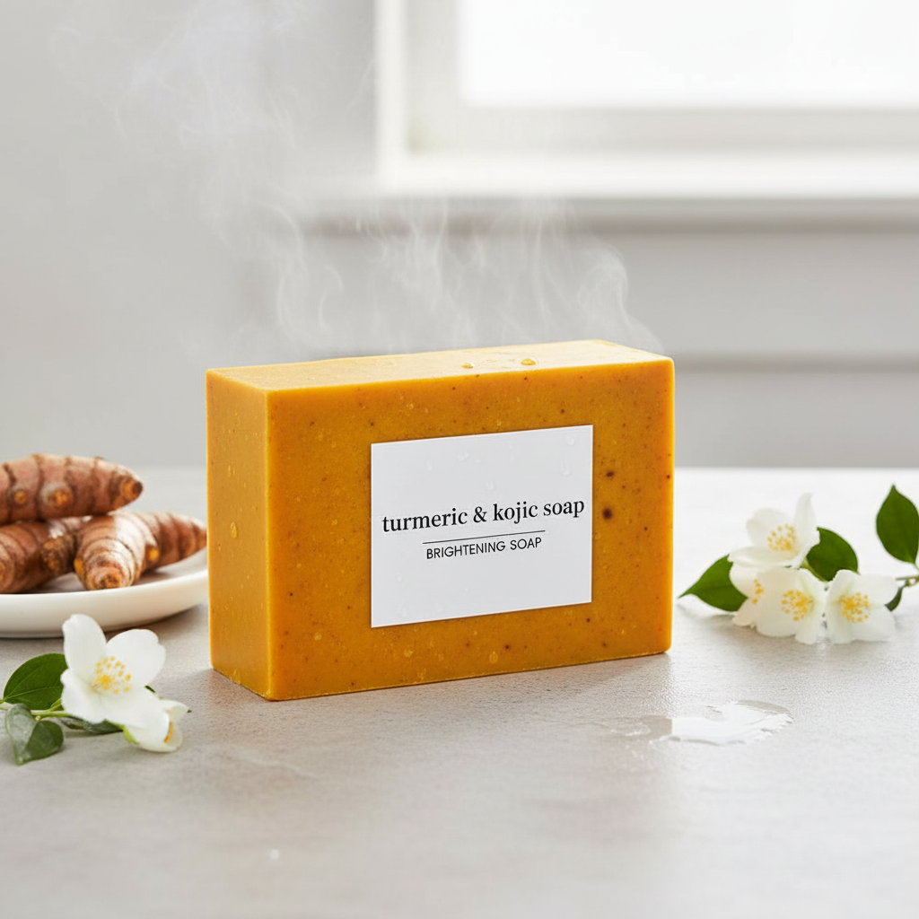 Answer 1: This soap features a unique blend of natural ingredients, primarily turmeric and kojic acid, known for their gentle and effective properties. Turmeric is recognized for its anti-inflammatory and antioxidant benefits, while kojic acid helps brighten skin tone. The formulation avoids harsh chemicals, making it suitable for sensitive skin, but as with any new product, a patch test is recommended for those with specific skin concerns.
